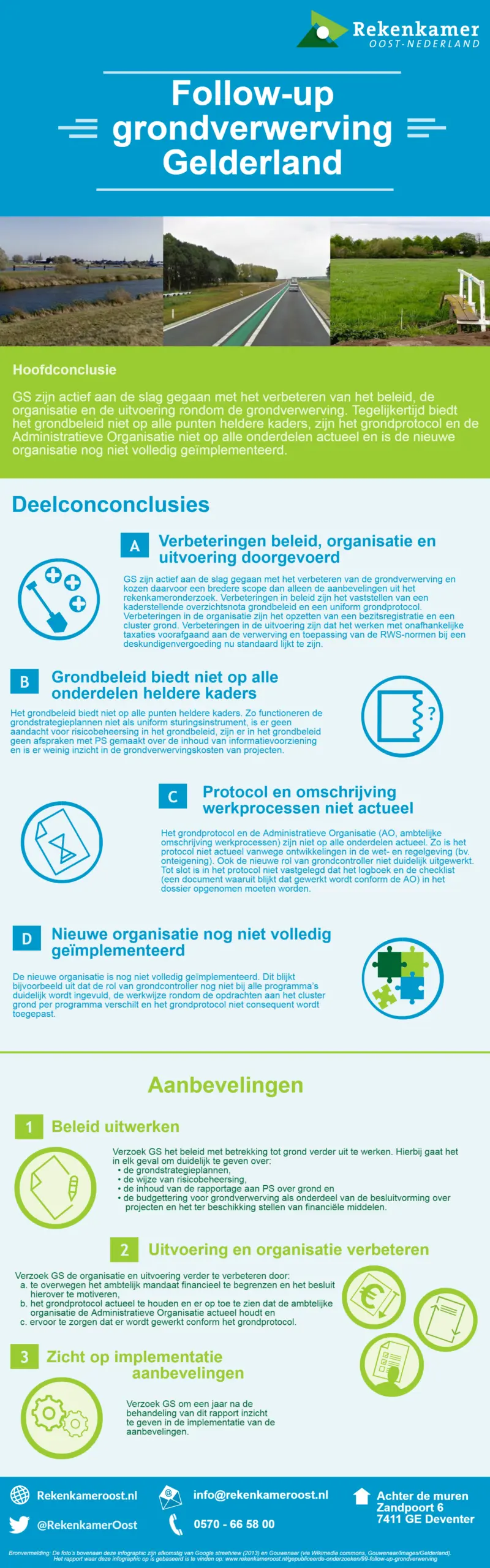 Drie jaar geleden waren we in ons onderzoek kritisch op de aanpak van de grondverwerving door de provincie Gelderland. Zo werd er niet altijd volgens de afgesproken werkwijze en mandaten gewerkt en waren de interne richtlijnen zoals protocollen en het beleid deels verouderd en aan actualisatie toe. Het onderzoek leidde tot zestien aanbevelingen. Mede daarom besloten we de aanpak van de grondverwerving door de provincie Gelderland opnieuw te onderzoeken en daarbij te kijken naar opvolging van de aanbevelingen uit 2013.